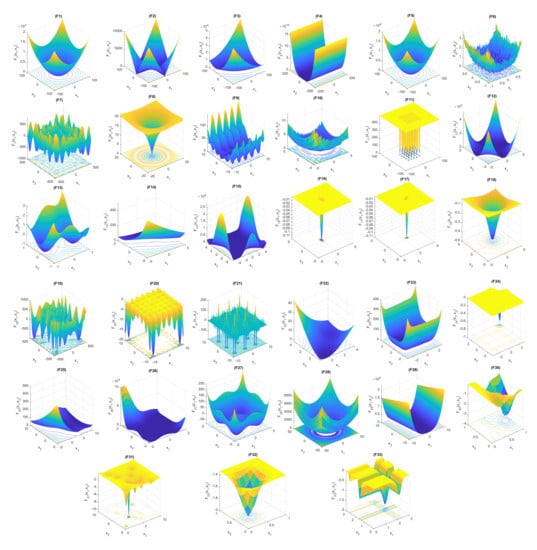 The surface plots of all the considered functions are shown in Figure 4. These plots will help to visualize required search space requirements for the single and multi global minima functions. In these functions, many categories were present based on their surface search area and shape. The classifications are bowl-shaped, plate-shaped, valley-shaped, single, and multiple-local minima functions. These functions have multiple local minima values with an ample search space, wide range, numerous layers, and multidimensional characters.