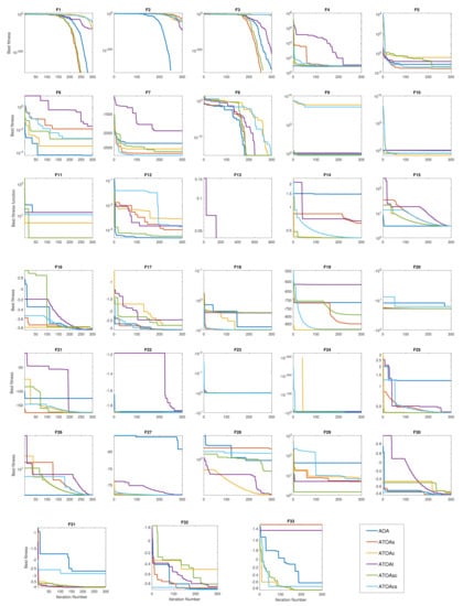 Convergence plots obtained from the different variants of the ATOA algorithms on various benchmark functions.