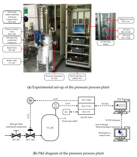 The piping and instrumentation diagram of the pressure process plant is illustrated in Figure 6b. The pressure process plant is controlled using “Remote Desktop Connection” mode from the central control room for safety. The host PC in the process plant uses the MATLAB/Simulink software to generate control signals based on the input set-point and the actual process variable. Data transmission and communication between the host PC and the process field devices (i.e., control valve actuator and pressure transmitter) happens via the peripheral component interconnect (PCI) cards. The PCI card contains three separate modules, namely 1713U, 1720U, and 1751. PCI-1720U performs the function of sending the control signals to the host PC using its 12-bit, 4-channel analog output port. In addition, all the interfacing cards are provided with isolation protection of 2500 V DC between the outputs of the PCI bus. The analog input from the process plant is received via a 12-bit, 32-channel analog input card PCI-1713U with a sampling rate of 100 k samples. The PCI-1751 card carries out the digital signals’ data transmission from the PT 202 to the host PC and vice versa. It contains 48 bits of parallel digital input/output, enabling the process plant to be controlled remotely.