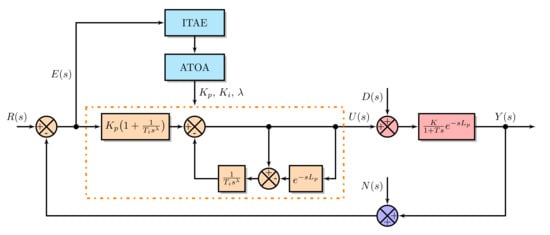 PI controllers are the most well-known and widely adopted controllers in most industries. However, they perform poorly in an environment having delay, noise, network-induced delay, and high-frequency noise [,]. On the other hand, advanced control strategies, such as model predictive controller and generalized predictive controller, are computationally and structurally complex for implementation. Thus, the controllers need a simple design, effective dead-time compensation, and high disturbance-rejection characteristics to overcome the above issues. Such a type of controller is proposed by Arun et al. [], which has the dead-time compensating capability of the Smith predictor and robustness nature of the fractional-order controllers. Therefore, in this article, such an efficient fractional-order predictive PI (FOPPI) controller designed by them is utilized. The selection of pressure process application for this research is due to its nonlinearity and sensitivity []. The FOPPI controller generates an effective control signal which is free from load variations and plant uncertainties. However, their controller parameters are obtained analytically, and those values are insufficient to mitigate the real-time process disturbances []. Thus, the proposed ATOA and conventional AOA techniques are utilized in this research to obtain effective controller parameters. The adequately tuned parameters are used for experimentation on the real-time pressure process plant.