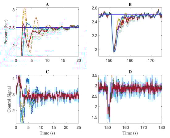 Zoomed regions of Figure 8 showing the process output (A,B) and control action (C,D).