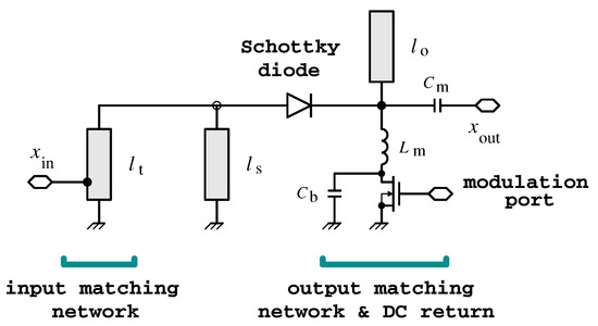 In [13,19,20,21] identification information was encoded in the amplitude modulation of the second harmonic. In [19] the modulation was achieved by varying the bias point of varactors along a nonlinear transmission line using a digital modulation unit. In [20] an implantable system was proposed for wireless neurorecording, based on a varactor pair, which mixed the fundamental RF carrier with the low-frequency and low-voltage signals represented by the neuropotentials. In [13] a low-voltage oscillator was used to periodically change the dc bias point of a Schottky diode. In [21] a radiofrequency (RF) switch was placed between the antenna and the doubler to periodically vary the input matching of the doubler. In the above papers, the modulation was obtained either by varying the bias point of the nonlinear element or by varying the impedance in the RF path, and high-frequency modulation circuitry was needed.