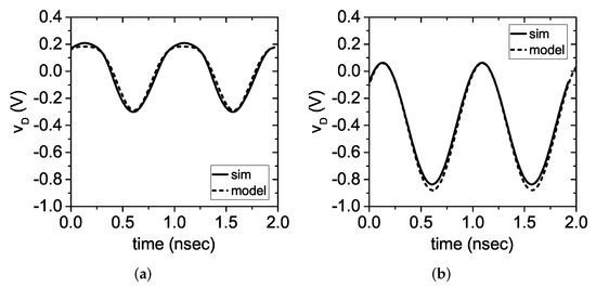 In the proposed circuit, A, , and . Therefore, at dBm, mV. This means that when the switch is open mV, mV, and mV. When the switch is closed, instead, mV and mV. Although this analysis is simplified, it shows that the second harmonic voltage when the switch is closed is significantly larger than the voltage when the switch is open. This is the very principle used to perform the OOK modulation. The obtained values compare well with the results obtained from the Harmonic-Balance simulation of the circuit in Figure 2. The comparison between the simulated diode voltage and the model is shown in Figure 4.