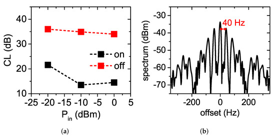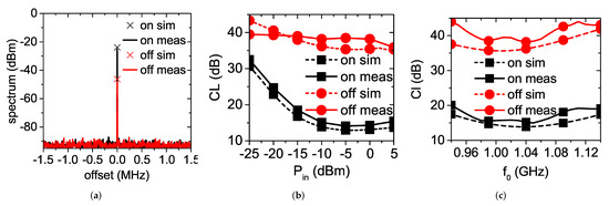 The output spectrum of the doubler at dBm and GHz with the MOSFET switched on and off, respectively, is shown in Figure 6a. The supply voltage for the “on” state was set to 3 V. The measured RF output power when the MOSFET was off was attenuated by 23 dB with respect to the output power when the MOSFET was on. Figure 6b shows the conversion loss of the doubler versus its available input power at the design frequency of GHz, when the MOSFET was switched on (square symbols) and off (circle symbols). The RF input power varied from dBm to 5 dBm. The results of the simulations are included for comparison. The small discrepancies between simulations and measurements are due to inaccuracies in the component models and due to manufacturing tolerances. At the design power of dBm, the measured CL was dB when the MOSFET was on and equal to dB when the MOSFET was off. It is worth noticing that this was achieved exclusively through the variation of the dc termination. The on/off ratio of the conversion loss was almost constant for larger RF input powers, while it decreased for lower powers. This is due to the fact that the self-generated dc voltage counter-biasing the diode is very small in the linear region. Nevertheless, an on/off ratio of about 15 dB was still observed for dBm.