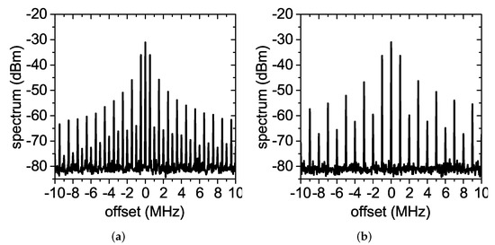 Figure 8 shows a comparison between the measured output frequency spectrum at MHz and MHz for equal to and dBm and the spectrum values predicted by (23). The first sidebands at MHz were dB and 5 dB below the carrier for dBm and dBm, respectively, while the first sidebands at MHz were dB and dB below the carrier. These values were larger than the 4 dB predicted by the developed simplified theory. Additionally, faint spectral components were noticed at , ,…, which were not predicted by (23), and the discrepancy between measurements and theory increased as the order of the sidebands increased. These differences are due to the fact that (23) represents the output spectrum obtained multiplying the tone by an ideal square wave. It did not consider that the applied voltage square wave is affected by transients and small asymmetries, that a small output power is generated by the doubler when the MOSFET is off, and that the MOSFET switch has its own transfer function. Nevertheless, the amplitude modulation was still well recognizable in both cases.