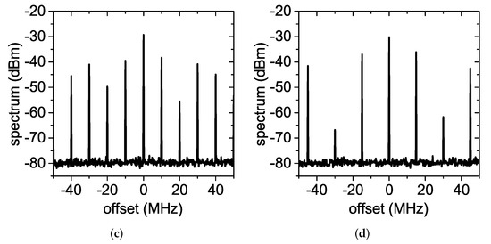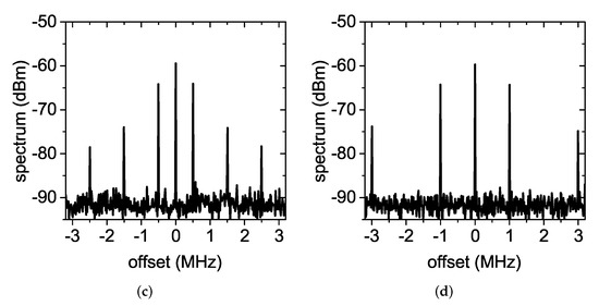 Output spectrum of the modulation-capable frequency doubler with dBm. (a) kHz, (b) MHz, (c) MHz, and (d) MHz.