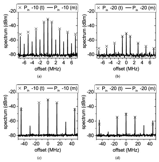 Output spectrum of the modulation-capable frequency doubler: comparison between theory and measurements. (a,b) MHz and (c,d) MHz. (a,c) dBm and (b,d) dBm. “t” stands for theory and “m” for measurements.
