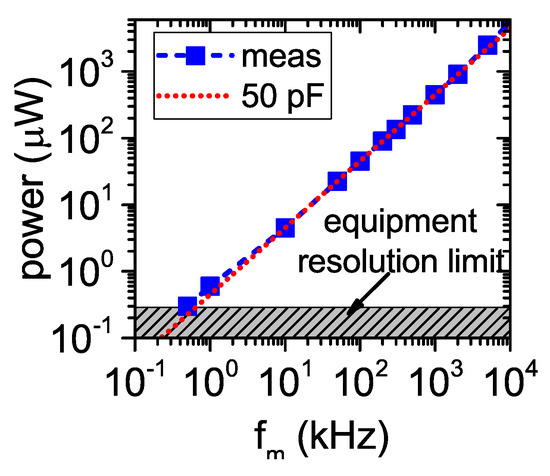 Dynamic power consumption of the modulator as a function of the modulation frequency. The equivalent capacitor pF is estimated from , where V, with the aim to obtain the best match with the measurement results in the modulation frequency range of interest.