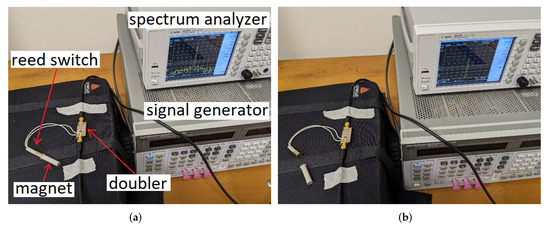 Among other things, this solution can be used to monitor the rotational speed of machines and motors and can be used for passive wireless sensing just connecting the RF ports of the doubler to two antennas (one operating at f0 and the other at 2f0). In the experiment shown in Figure 14, the doubler with the reed switch was used to measure the rotational speed of an electrical motor. A roll was connected to the motor. Four magnets were applied to the border of the roll, placed at equal distance. Four magnets were used instead of one to increase the measured frequency (the limited resolution bandwidth of the spectrum analyzer used for the acquisition hindered the detection of modulation frequencies below 20 Hz). The reed switch connected to the doubler was placed close to the border of the roll. This way, the reed switch was switched on every time one of the magnets passed in front of it. The measured spectrum is shown in Figure 13b. Although the rotating frequency was close to the limit of the resolution bandwidth of the used spectrum analyzer, we can still see the two side bands occurring at Hz with respect to the output carrier frequency. The correctness of the measured rotational speed was confirmed also by a photoelectric rotation sensor (that exactly counted the number of turns per second) connected to an oscilloscope.