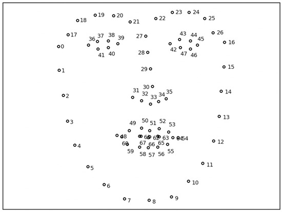 The OpenFace library [38] was used to detect 68 key points called (facial) landmarks on the human face, as shown in Figure 1, and return their coordinates. Given an image of a human face, this widely used machine vision library is pre-trained to detect and track specific keypoints in real time. The limitation is that the entire face has to be clearly visible to the camera for the 68 landmarks to be detected. This means that detection can fail if the face is turned above a certain threshold or if it is far from the camera.