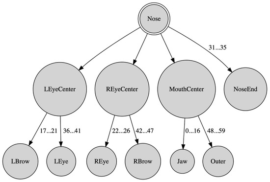 In this work, a human face was represented as a tree data structure induced from the facial landmarks, as presented in [39,40]. In this representation, selected landmarks were utilized to consequently construct a tree hierarchy of features, which was then used as a computational primitive in the context of lattice computing. More specifically, except for the root node, every tree node corresponded to a vector, represented by polar coordinates, connecting its parent node to a point; hence, each node was characterized by two values, namely the corresponding vector’s length r and orientation φ. The tree data structure is illustrated in Figure 2, where, for concise visualization reasons, related nodes are grouped together. Each tree node is a facial feature, computed using the original landmark data. The facial features used to construct this tree representation were chosen because of their significance in constituting the human face. The polar coordinates for each node constitute the spatial arrangement of the nodes and their relation to each other.