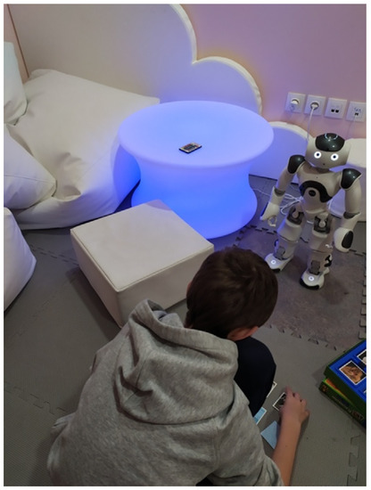 In special education, more specifically regarding Autism Spectrum Disorder (ASD) interventions, the ability of robots to improve the social and communication skills of children has been confirmed [3]. Numerous studies have demonstrated the use of social robots toward improving social skills such as joint attention [4,5,6]. Safety issues have also been considered [7]. The typical approach for an effective interaction with a human is to ensure that, first, the robot attracts a child’s attention, followed by, second, a high level of engagement throughout an educational session. Consequently, the robot pursues an effective interaction by timely issuing visual (e.g., movements, blinking lights, facial expressions) or auditory (e.g., speech, sounds, music) stimuli triggered by feedback sensory data techniques. The types of interaction engaged depend on factors such as a child’s language skills [8].