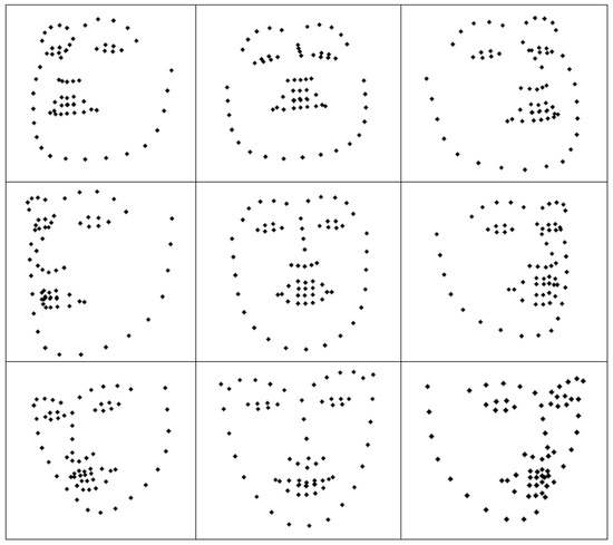 The robot used its own sensors to log both its environment and itself. To maximize the detection capabilities of the OpenFace library, appropriate lighting conditions were ensured in the therapy room, and the robot has been programmed to move its head to track the child and maintain visual contact for as long as possible. In particular, the robot was recording a variety of anonymous data regarding the child in real-time including facial landmarks, body pose, hand gestures and eye contact as well as the volume and duration of the child’s speech. For the duration of the robot-assisted activities, the robot’s camera was continuously capturing images of the child, which were then fed to the OpenFace library in order to perform the detection of the 68 landmarks and return their (x,y) coordinates. At the same time, the robot kept track of its own actions including its body motions, posture, animations, audio playback, speech, eye LED activity, whether eye tracking was active and whether its sonar sensors detect objects in close proximity. The outset of a robot action is called an event. All the recorded data values (robot actions and child data) at a sampling time constitute a frame. Frames were acquired in this work at a sampling rate of 3 Hz, i.e., 3 frames per second. A frame is called complete if and only if it includes values for both the child’s face and the robot’s actions. The present work considers exclusively the frame values in Table 1, where the state of a child was defined by the 68 human face landmarks points. Frames where the child’s face was not recognized were discarded.