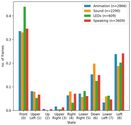 It is clear from Figure 8 that the majority of frames belong in the Front state, regardless of the robot modality. The latter is a confirmation of the fact that the robot attracted the child’s attention when it was producing some audio or visual stimulus. In particular, the aforementioned effect appears to be more pronounced when the robot was performing an animation or speaking. It must be noted that robot speech was configured to also be accompanied by random hand gestures, and therefore, for this robot modality, both audio and visual stimuli were present.