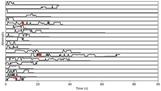 The set of all strings with the aforementioned criteria were computed in all the 90 eligible attempts, and it was found that state sequence (string) “806” and its equivalent patterns occurred most frequently. More specifically, the aforementioned strings (and their frequencies within parentheses) include “806” (16), “8066” (11), “8806” (11), “8006” (11), “88806” (7), “80666” (7), “88066” (7), “80066” (7), “88006” (7), “888006” (6), “800666” (6), “880666” (5), “888066” (4), “880066” (3), “80006” (3), “8880066” (2), “880006” (2), “8800666” (2), “8880666” (2), “88800666” (1), “800066” (1), “8800066” (1), “8880006” (1), “88800066” (1). Figure 11 displays 20 attempts, randomly selected out of the 90 eligible attempts, that include complete frames. It also indicates the occurrences of equivalent to “806” strings in red color.