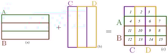 A unique overlapping layout for the four sensors as a 2 × 2 array is depicted in Figure 3, which is an illustrative view for a multi-capacitive sensor with two overlapping horizontal sensors, A and B (Figure 3a), two overlapping vertical sensors C and D (Figure 3b), and finally the unique arrangement of the four sensors (A, B, C, D) (Figure 3c).