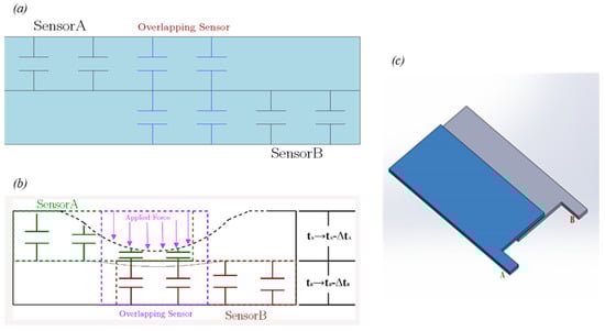 (a) Overlapping sensors A and B schematic view without contact; (b) Sensors’ capacitances change due to force applied. ∆tA—change in dielectric thickness of sensor element A; ∆tB—change in dielectric thickness of sensor B; (c) The view of sensors A and B with overlapped layers.