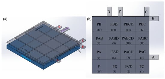 (a) A 3D view of the multimodal sensor showing the 5 sensor layers (P, A, B, C, and D); (b) a physical map of the 16 tactels.