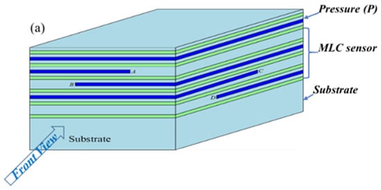 The MLC sensor structure consists of nine layers of electrodes (Figure 2). Four of these are signal electrodes, and the other five are ground electrodes. Layers of silicone dielectric separate them. Sensor A is in the top layer, and sensor D is in the bottom layer. This means that sensor A will be deformed first when an object touches the sensor. The changes in sensor geometry due to deformation has been discussed in the previous substrate study []. When a force is applied, the deformation of the sensor is affected by the thickness of the different structural dielectric layers, and therefore the capacitance change in sensor A (top layer) should be slightly greater than that of the bottom layers.