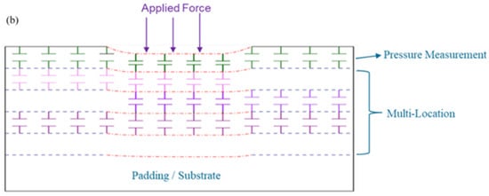 The complete multimodal sensor structure, which is illustrated in the cross-section view of Figure 6, consists of the following three different layer groups: pressure sensor (P) layer, multi-location (MLC) sensor layer, and a substrate layer. The deformation of the top layer and the subsequent change in capacitance allows pressure measurement when a force is applied. When the sensor is loaded, as shown in Figure 6b, the pressure sensor (P) layer will be deformed, and the associated sensors (A, B, C, D) will also be deformed. Hence, the reading of the change in capacitance of the P sensor, together with the digital output of sensors A, B, C, and D of the MLC sensor, provide two pieces of information, i.e., the magnitude of the pressure through P and the tactel location through the digital output (A, B, C, D) of the MLC sensor. A substrate layer of optimum thickness [] increases the sensor’s sensitivity and allows it to be sensitive to forces lower than 2 N. Hence, the layers of this multimodal sensor, from top to bottom, are the encapsulation (protection) layer of 100 μm, a pressure sensor layer, P (600 μm thick), the 4 sensors (A, B, C, and D) of the MLC sensor (total 2400 μm thick) in the middle, and the substrate (1900 μm thick) at the base.