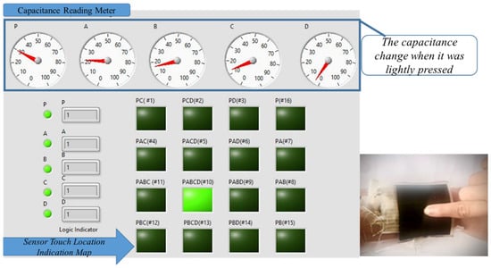 For ease of quantifying the capacitance change within the five sensor layers (P, A, B, C, and D), despite the effects of stray capacitances, the no-contact capacitance was subtracted from each measured value in LabVIEW, and only the change in capacitance considered. Considering that the multimodal sensor has noise and parasitic effects, the threshold needs to be adjusted accordingly. When the sensor is touched/pressed, one or more of the five sensors will react with a change in the capacitance.