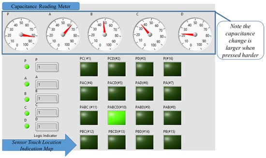 The LabVIEW program can indicate which tactel is touched/pressed through the reading of sensors P, A, B, C, and D (MLC sensor) based on the truth table in Table 1 and the amount of pressure is quantified with the amount of change in capacitance by sensor P. The adaptive thresholding is necessary to encode the change in capacitances into digital output, as the capacitance change will increase when the applied pressure is increased. The adaptive thresholding is simple and is adjusted by calculating the relative change in the P sensor to encode the capacitances value in P, A, B, C, and D into a digital value.