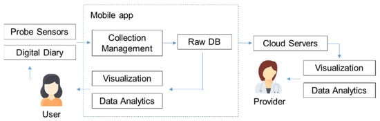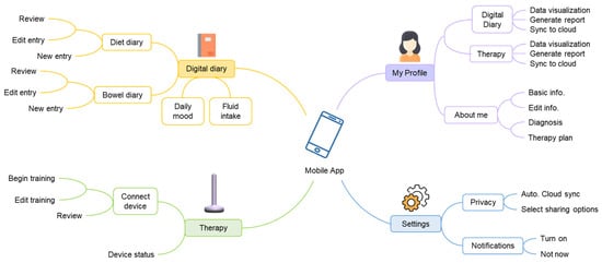 An IoMT gateway and interface for the user, a mobile app, was developed to provide users with real-time visual feedback during training and guidance on therapy activities. In addition, we have developed a digital version of the physical diary, used to record clinical indicators to evaluate therapy progress and success. The specific information structure of the mobile app is presented in Figure 5.