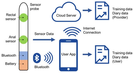 The components of the proposed IoMT are presented in Figure 1. The data acquisition is composed of an insertable probe, where sensors capture rectal and anal sphincter pressures. Users also have the option to enter diet, symptom, and stool data into a digital diary (this would replace the physical diary required for clinical BF). To improve upon the usability of previous devices, our probe is wirelessly connected to the users’ mobile phone via a dedicated app, which is the IoMT gateway. Data is collected in the app and can be sent to cloud servers (with user permission), where it is stored and can be accessed by nominated health providers using a web application. The collected data will be used for patient treatment and to create a dataset for future research activities.