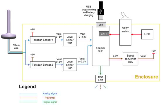 Given the sensing probe, we needed to design a networking and battery component to power the sensors, collect user data, and send it to the mobile app. For the prototype stage, we designed a small circuit using the Adafruit Feather nRF52840 Express [36], which is a new microcontroller with Bluetooth low energy (BLE) and native USB support. It includes the ARM Cortex-M4F processor, 1 MB flash, and 256 KB SRAM. BLE has been selected as it is a short-range wireless technology with low power consumption, which is the best option for a battery-operated device. The circuit diagram and its components are illustrated in Figure 4, with indication of analogue signals, digital signals, and power rail.