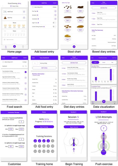 For the interface design, the principles of simplicity, user friendliness, and usability are adopted. As shown in Figure 6, the interface includes the home page, a bowel diary (symptoms, stool chart), a diet diary (daily caloric intake, nutrient information), a therapy record, and a BF therapy section (training regime and visual feedback). The BF training is tailored to the user’s diagnosis and set target goals, for example, to improve anal sphincter squeeze force to within normal range. A series of training sessions are scheduled over treatment period, involving coordinated anal sphincter and rectal muscle exercises. The user’s muscle tone is represented in real-time by two grey circles (anal sphincter and rectum), with stronger contractions reducing the circle size and relaxation increasing the circle size. Predetermined values (e.g., normal pressure ranges) are represented as green circles and the training involves users matching their grey circle to the green circles with respect to size, coordination, and timing (Figure 6).