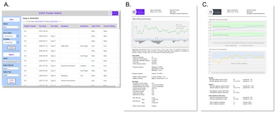(A) Web application for user data search. (B) Example of summary report for bowel digital diary. (C) Example of summary report for biofeedback training.