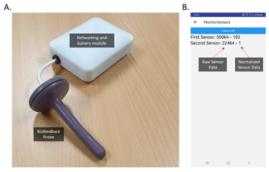 (A) The new IoMT sensing probe attached to networking/battery module. (B) The mobile app showing real-time output data from sensing probe. Raw sensor data and normalized values from first sensor (anal sphincter) and second sensor (rectal) are displayed.