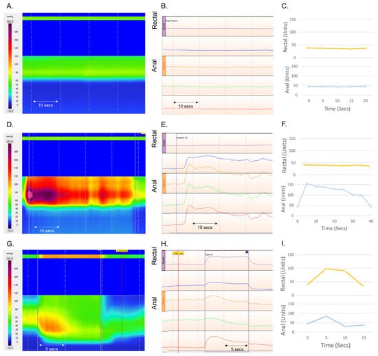Biofeedback manoeuvres profiles depicted using high-definition anorectal manometry (HD-ARM) presented as a detailed topographical plot and waveform plot (rectal and eSleeve sensor outputs labelled), and new IoMT graphically presented as units over time in rectal and anal sensors. (A–C) Resting baseline pressures over 20 s. (D–F) Squeeze and hold manoeuvre up to 30 s. (G–I) Simulated defecation, push manoeuvre.