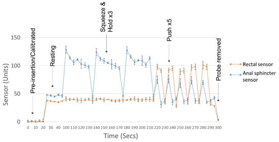 The new IoMT (Figure 8) was used to perform anorectal BF manoeuvres in a healthy volunteer (34-year-old male) in 3 sessions over consecutive days. The IoMT sensing probe was paired with the mobile app and calibrated (zeroed) at room temperature and atmospheric pressure. A condom sheath was placed over the probe and sufficient water-based lubricant was used for a comfortable insertion. There was approximately 10 mm of distance between the anal verge and the device base. The user lay on their side (left lateral position) and inserted the probe into the anal canal. Correct positioning is confirmed by performing a quick anal sphincter squeeze to see the corresponding increase in the anal sensor value. The user underwent a 20 s rest period before performing 3 squeeze and holds, and 3 simulated defecation manoeuvres. The resting pressure was calculated from the averaged anal sphincter values recorded in 5 s intervals over 20 s. The maximum squeeze values and endurance (time to return to baseline) were recorded. Defecation dynamic parameters recorded include the recto–anal pressure gradient (pressure difference between the rectal and anal pressures taken over 2 s at the highest recto anal pressure gradient during the push manoeuvre) and the percentage of anal relaxation (residual anal pressure/anal resting pressure) × 100, where residual anal pressure is taken over 2 s.