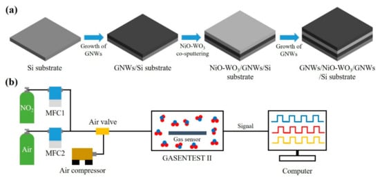 Schematic illustration of GNWs/NiO-WO3/GNWs heterostructure-based NO2 gas sensor. (a) Fabrication process of GNWs/NiO-WO3/GNWs heterostructure-based NO2 gas sensor using PECVD and sputtering system. (b) Measurement of sensing performance under exposure to NO2 gas.
