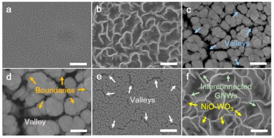As shown in Figure 2, various morphologies of the GNWs/NiO-WO3/GNWs heterostructure were displayed by FE-SEM. Figure 2a,b correspond to the surface of untreated (or pure) GNWs consisting of high-density pores with a diameter of 50–200 nm (macropores). Such macropores can be a key factor to detect the gas molecules because they can induce double-sided adsorption with nanowalls in between. Considering that the diameters of nitrogen and oxygen are 0.3 nm and 0.4 nm, respectively, it is demonstrated that NO2 molecules can sufficiently attach at sides of nanowalls through macropores, resulting in their suitability as sensing materials. The surface images of the NiO-WO3-based metallic catalyst are shown in Figure 2c,d. When co-sputtering for the formation of the NiO-WO3 catalyst, tiny metal particles sputtered from respective targets (herein, W target and Ni target) created agglomerate composites with diameters of 120–220 nm. In general, thin films synthesized on planar substrates such as Si wafer and glass are uniform. Nevertheless, uneven surfaces with valleys between the NiO-WO3 agglomerations in the SEM image are due to their intensive synthesis onto the top edges of the GNWs. In addition, the surface boundaries (the orange arrows in Figure 2d) can serve as clear evidence for synthesis of NiO-WO3 consisting of two compositions. Secondary GNWs were then grown on NiO-WO3 by MPECVD, which are shown in Figure 2e,f. In contrast to the first GNWs grown on the Si substrate, the NiO-WO3 layer was faintly observed between the pores of the secondary GNWs with valleys. Interestingly, interconnected GNWs on valleys were observed, which may be formed from the geometric characteristic of NiO-WO3 (the yellow arrows and hazy section under GNWs). This suggests the growth principal of GNWs based on radical reaction from nucleation, thereby forming a nanostructure. Consequently, using PECVD and the co-sputtering system, the GNWs/NiO-WO3/GNWs heterostructure was ideally synthesized.
