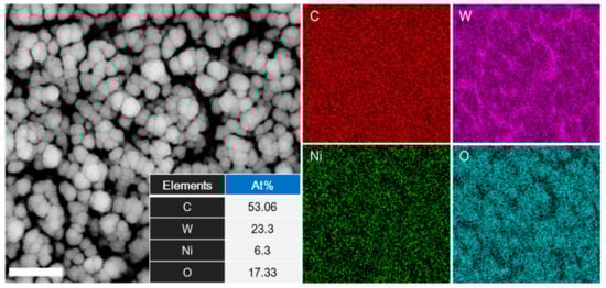 The comparison of the contents of carbon (C), tungsten (W), nickel (Ni), and oxygen (O) elements, calculated using EDS mapping (scale bar, 300 nm).