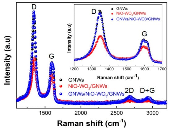 Figure 4 shows the Raman spectra of the GNWs (black scatters), the NiO-WO3/GNWs (red scatters), and the GNWs/NiO-WO3/GNWs (blue scatters). As crucial peaks, D (ca. 1350 cm−1), G (ca. 1580 cm−1), and 2D band (ca. 2700 cm−1) occurred in all samples. Typically, the high proportion of sp3 hybridization is significantly higher than the sp2 hybridization that was seen in the GNWs. In addition, the tops of the GNWs are similar to the graphene edges in their perpendicular structure. Hence, GNWs have a high D band and a low G band, unlike graphene and carbon nanotubes. The intensity ratio of the GNWs, NiO-WO3/GNWs, and GNWs/NiO-WO3/GNWs showed numerical variation. In this case, the ID/IG ratios of 2.14 (GNWs), 1.55 (NiO-WO3/GNWs), and 2.24 (GNWs/NiO-WO3/GNWs) were confirmed, where a notable change is a lowered value from 2.14 to 1.55. This decrease in intensity suggests that the NiO-WO3/GNWs was formed as composites. Nevertheless, the I2D/IG ratio was retained at less than 1, which means that the GNWs consist of multiple graphene layers.