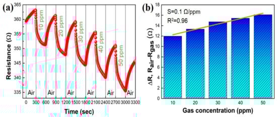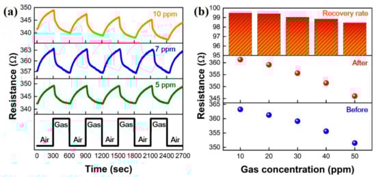 To identify the repeatability of the GNWs/NiO-WO3/GNWs-based gas sensor under consistent concentration, measurements in 5, 7, and 10 ppm were conducted over several times, as shown in Figure 6a. Under conditions of alternate injection of air and gas for 300 s, outstanding repeatability was confirmed. In the repetitive test at 5 and 7 ppm, the measured average resistances were 7 and 9.16 Ω, respectively, displaying identical signal patterns. This may be because the adsorption and desorption of NO2 molecules are highly stable at low concentration and room temperature. However, the repeatability test at 10 ppm showed an interesting phenomenon, drawing a pattern that does not fully recover at room temperature. This phenomenon is similar to the response characteristic according to 10–50 ppm observed previously. Herein, we can infer that NO2 molecules adsorbed from more than 10 ppm were not thoroughly desorbed in the recovery interval and at room temperature, thereby demonstrating a phenomenon to lower the resistance value before gas response by successive accumulation of NO2 molecules. Figure 6b shows the recovery characteristic according to a concentration from 10 up to 50 ppm. The numerical gaps between before and after the gas response were 1.94, 2.15, 3.51, 4.11, and 5.49 Ω, respectively. The recovery rates are defined as the ratio after exposure/before exposure to gas in this section, and at each concentration they were close to 100%, with a minimum of 98.4% and a maximum of 99.47%. As mentioned at 10 ppm in Figure 6a, it can be seen that the recovery rates decrease as the concentration increases. This may be because the molecules adsorbed at more than 10 ppm still remained at a low amount at the recovery step, which is similar to the symptoms confirmed in the repeatability test.