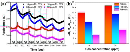 On measurement of gas-sensing performance, since the relative humidity (RH) is a very important factor in room temperature, a humidity test was evaluated at RH 33% and RH 66% (as shown in Figure 7). Figure 7a shows the tendency that the resistance was inversely proportionate to the humidity. This may be because NO2 gas is diluted by humidity. Moreover, when there was no significant difference between the gas concentration and humidity, an ordinary response curve was showed, whereas in the case of a large amount of humidity, a response delay (black, red, and magenta arrows) was recorded at the initial stage, with a low response signal. Figure 7b exhibits the resistance-change-versus-gas concentration (10 and 30 ppm) at each humidity from 0 to 66%. Consequently, the GNWs/NiO-WO3/GNWs heterostructure-based gas sensor was greatly affected by the humidity, and it denotes that introduction of an ultraviolet irradiation system leading to enhanced stability in humidity during exposure to suitable UV wavelengths may be required to overcome the effects of humidity [].