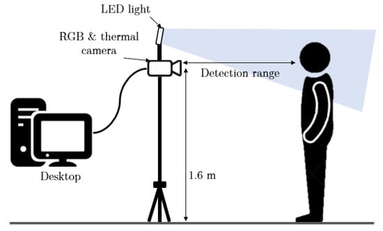 In this study, a thermal camera (Rakinda Technology, FT20) and an RGB webcam (Logitech©, C270) were employed to collect thermal and RGB videos from human subjects. The thermal camera operates at 25 fps and its resolution is 256 × 192, the RGB camera operates at 30 fps and its resolution is 640 × 480. These cameras are placed side by side horizontally on a pole and the height is 1.6 m. An LED camera light (Neewer, model 176 LED) was placed close to the cameras to enhance illuminations on subjects’ faces and to avoid shadows (normal indoor illumination level). The setup of the devices is shown in Figure 1. To evaluate the performance of the proposed system in vital sign estimation, an optical PPG sensor (Sparkfun, heart rate sensor), a force-based chest respiration belt (Vernier, Go Direct) and a handheld infrared forehead thermometer were used as reference measurements of heart rate, respiration rate and body temperature, respectively.