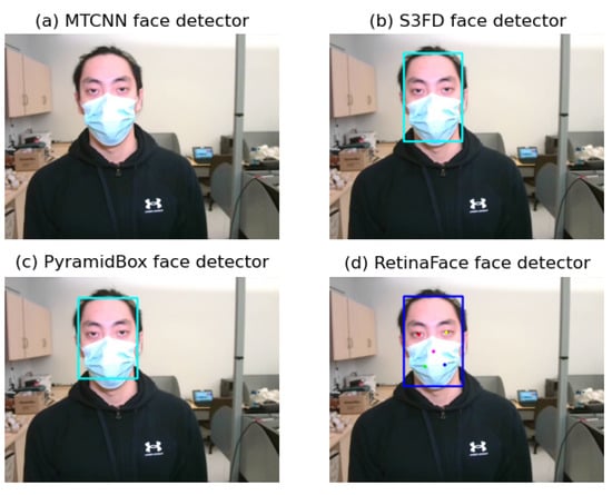 We applied the RetinaFace [20] framework to detect faces from the RGB video frames. RetinaFace was proposed by Deng et al. and ranks second in the competition of WIDER FACE (Hard). The WIDER FACE dataset [21] is a face detection benchmark dataset with 32,203 images and 393,703 labeled faces which has a high degree of variability in scale, pose and occlusion. RetinaFace is a practical single-stage deep learning based face detector working on each frame of the video. Consequently, we chose it because only the RetinaFace detector can detect both face and facial landmarks with the confidence score over 0.9 comparing to some widely used face detectors including MTCNN, S3FD and PyramidBox. An example of face and facial landmarks detection using these face detectors when a subject was wearing a face mask is illustrated in Figure 3.