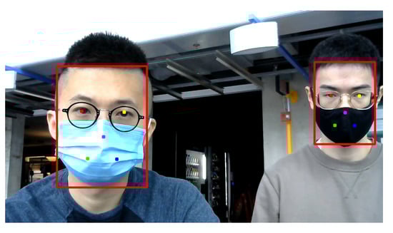 An example of multiple subjects’ faces (red bounding boxes) and facial landmarks (colored dots) detected by RetinaFace detector when they were wearing face masks.