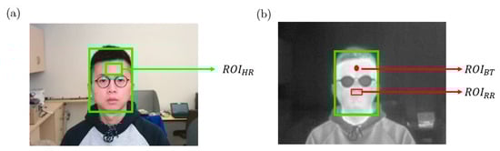 ROIs employed for vital signs estimation, (a). the location of on the RGB image, (b). The locations of and on the simultaneous thermal image.