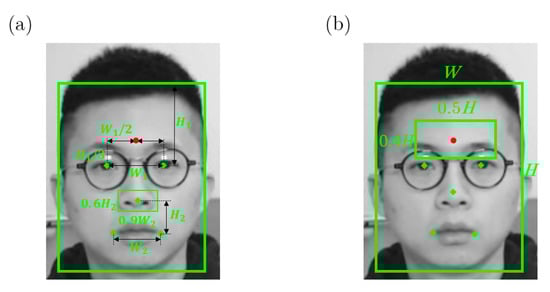 A demonstration of ROIs localization using facial landmarks, (a) the definitions of and , (b) the definition of .
