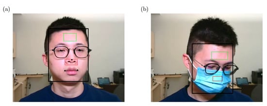 Several different ROIs used for remote HR estimation are described in existing research. Some researchers used the bounding box of the face given by the face detection algorithm as the ROI [6,23,24,25,26]. Other researchers used the forehead area of the detected face as the ROI for HR estimation [6,23,27]. Through our experiments, the forehead area always performed better than the face area in HR estimation and the forehead will not be occluded by a face mask, therefore the forehead was determined as . The center point of the is . The height of the is 0.4 of the height of the bounding box and the width of the is 0.5 of the width of the bounding box detected by the RetinaFace detector. A demonstration of location can be found in Figure 6b.