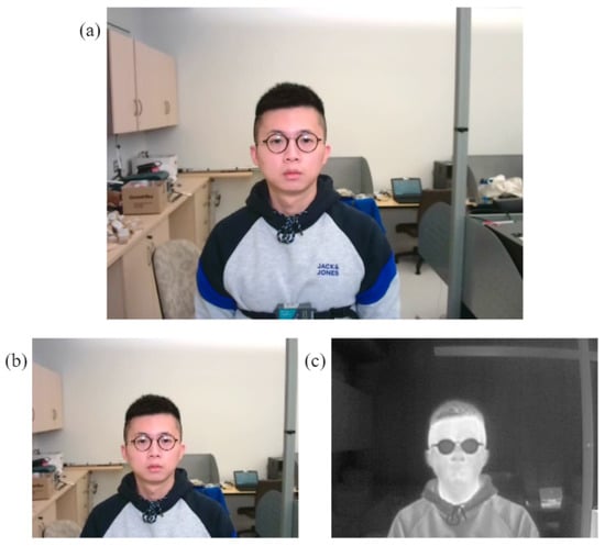 Translation transformation is caused by the difference between the position of the two parallel cameras. Since the imaging planes of the RGB camera and the thermal camera are within the same plane, the displacements are along the x axis and the y axis. Scale transformation is caused by the focal length. The lens of the RGB camera has a shorter focal length compared to the lens of the thermal camera, and so the RGB camera captures a much wider field of view while producing a smaller picture. Figure 8a shows the original frame with 640480 captured by the RGB camera, and Figure 8b,c show the synchronous and registered thermal frame and RGB frame with 256192 using the transformation matrix T.