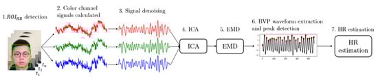 The steps of HR estimation proposed in this study are shown in Figure 9. After locating the from an RGB video frame by frame, the raw color channel signals can be extracted by calculating the mean values of red, green and blue channels within . A 3rd order Butterworth bandpass filter with the passband of 0.8–2 Hz (corresponding to 48–120 beats/min) is applied on raw color signals for noise reduction.