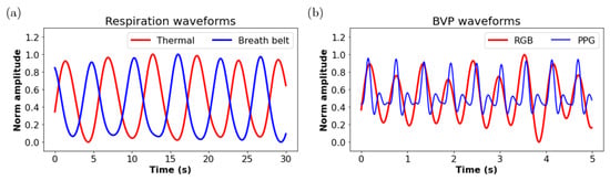 (a) Respiration waveform extracted from the thermal camera (red) and the reference measurement using a breath belt (blue), (b) BVP waveform extracted the RGB camera (red) and reference PPG waveform (blue).