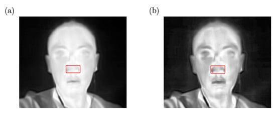 To resolve these problems, contactless monitoring systems have been designed and applied in the aforementioned scenario. Contactless monitoring systems rely on a number of sensors such as radars, sonars, different kind of camera and so on. In this paper, we will limit our analysis to camera-based systems. Xiaobai Li and Jie Chen et al. proposed a method that can measure HR remotely from face videos [2]. After that, many researchers used the green channel of face images collected from a webcam or smartphone to measure the heart rate [6,7]. On the other side, with the decline of the cost and size of optical imaging devices such as infrared cameras and thermal cameras, the respiratory signal can also be measured by remote monitoring [8,9,10]. Youngjun Cho et al. proposed a respiratory rate tracking method based on mobile thermal imaging [3]. One low-cost and small-sized thermal camera connected to a smartphone was used as a thermographic system to detect the temperature changes of the nostril area caused by the inhaling and exhaling. There have been some other works [4,11,12] related to monitoring the respiratory signal using the thermal camera. However, the detection distance between the human face and the thermal camera is limited to less than 50 cm in Cho’s work [3] and the estimation error increases with the distance between the subject and the camera. In addition, some face detection algorithms [3,4,11] perform poorly in detecting occluded faces if the subjects are wearing face masks and make it improper for COVID symptoms’ detection as a face mask is always mandatory in public places.